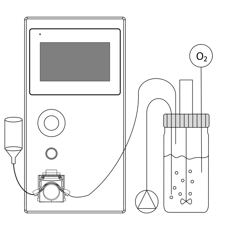 The LIFESCIENCE respirometer evaluate dynamically the OUR of the aerobic culture as a performance of the bioprocess. Differently from standard approaches, here the OUR is calculated using Oxygen measurement in the liquid phase (where the process is localized) and not in the gas phase. The sample is taken out from the main vessel into a test vessel where aeration is not present so that a O2 decline is observed and used to calculate the OUR value of the culture.